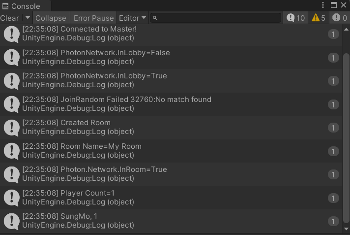 ▶ 자동으로 로비에 들어오지 않기 때문에 False 출력 -> JoinLobby()함수를 호출하여 로비에 입장 -> OnJoinedLobby() 콜백 함수가 호출됨