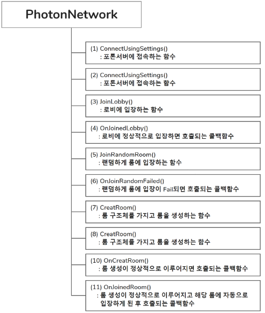 | ■OnJoinRandomFailed() | 아무런 룸이 생성되지 않았다면 룸에 입장하지 못하고 이 콜백 함수가 호출 |